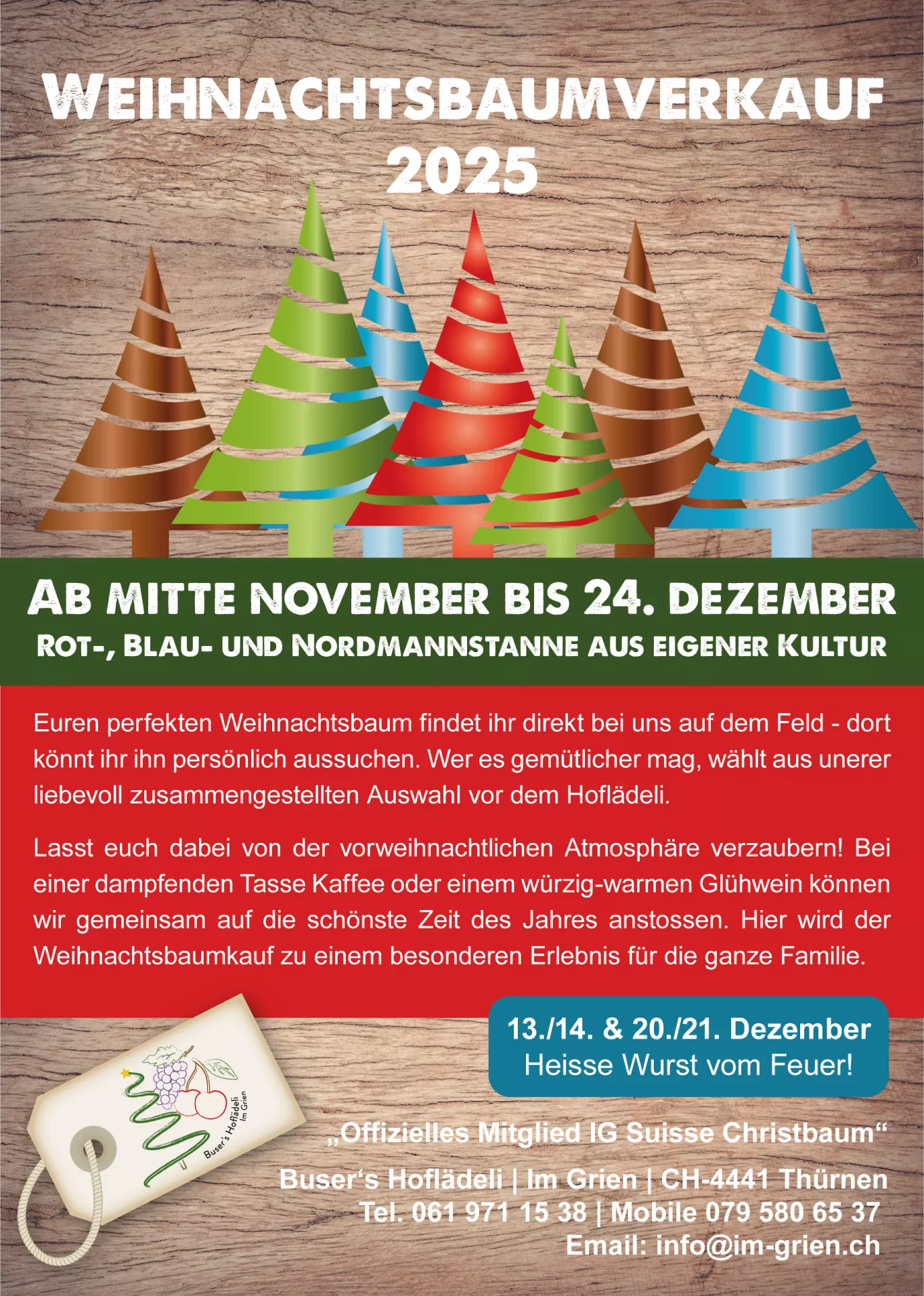 Markiert euch die beiden letzten Wochenenden vor Weihnachten. Dann könnt ihr beim Weihnachtseinkauf auf dem Hof im Grien eine Wurst vom Feuer geniessen. Lasst euch von der Vielfalt und Frische unserer Erzeugnisse sowie vom gemütlichen Weihnachtsambiente verzaubern. Wir freuen uns, euch auf unserem Hof zu begrüssen.